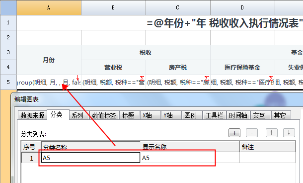以“月份”作为图表的分类,分类名称和显示名称设置为 A5 单元格,如下图: