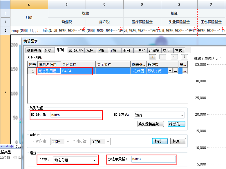 堆叠状态:选择“动态分组”;分组单元格:设置为“B3:F3”,这样就会将5个系列按照上图分组显示为2个系列,对应系列在同一个分组下以堆积的方式显示。