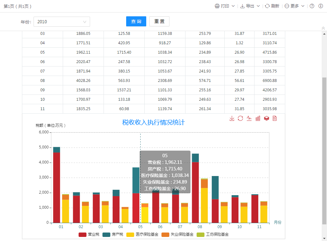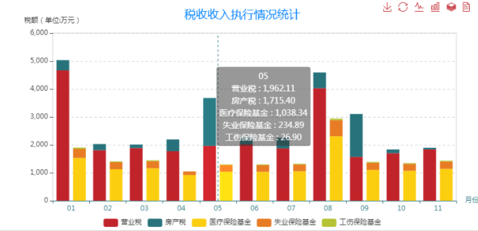 以堆积柱状图的方式展示每月各税收收入情况,效果如下: