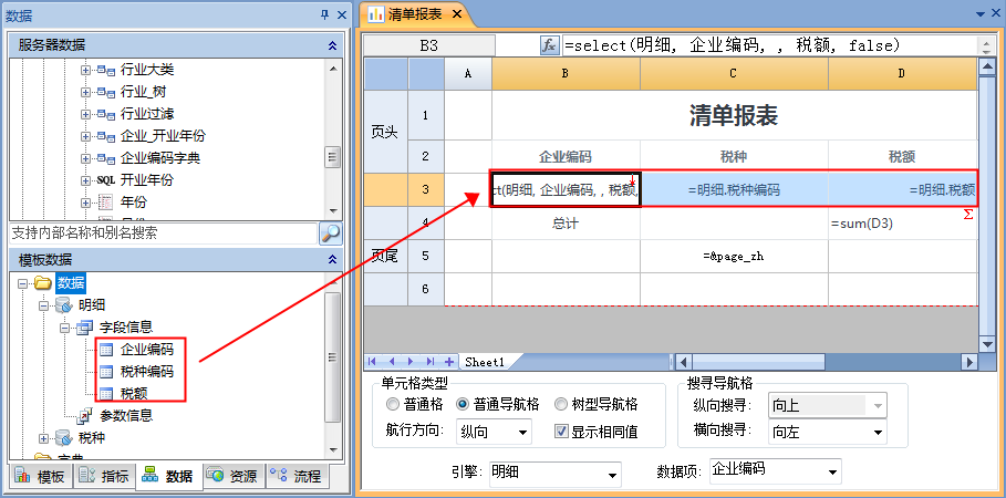 如下图示例,表格中有两个数据源的数据,税务部门来自“bm_swbm”表,税额来自于”ZS_MX”表,它们都有一个共同字段:税务部门编码,也就是说它们的数据之间有关系。