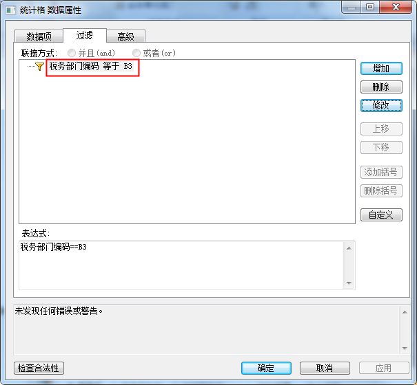 3)过滤条件设置:双击该统计格,设置过滤条件“税务部门编码==B3”,如下图: