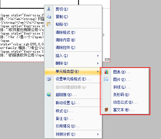 支持的单元格类型有图表、图片、斜线、条形码、动态公式、富文本,如下图所示: