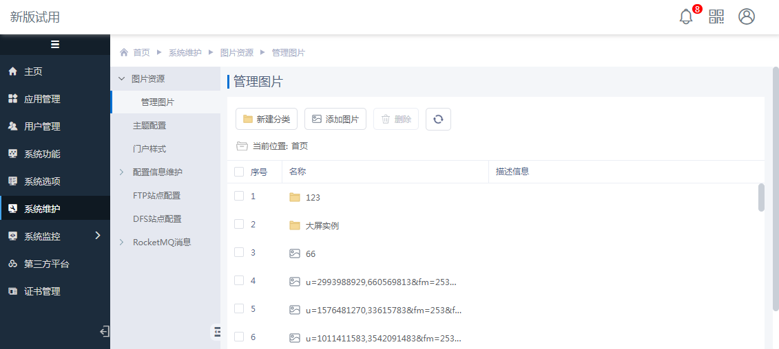 系统图片:选择系统中维护的图片,即:系统管理员身份登录门户系统,进入[系统维护>图片资源>管理图片],可以将本地图片作为系统图片进行使用。如下图: