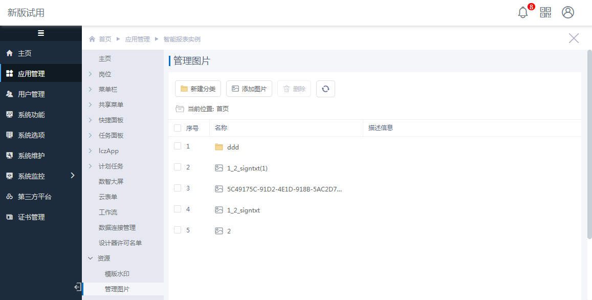 应用图片:选择应用内维护的图片。即:系统管理员身份登录门户系统,进入某应用的设计界面菜单[资源>管理图片],可以将本地图片作为该应用的图片进行使用。