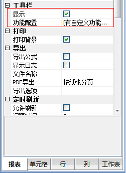 设置工具栏是在设计器的属性栏中的“报表”属性页中,如下图: