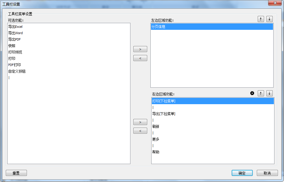 配置工具栏上出现哪些功能按钮及从左到右的先后顺序,以及出现在工具栏的左侧还是右侧。