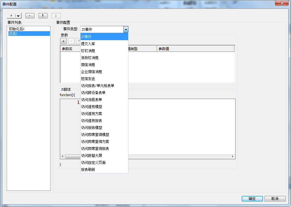 自定义按钮支持“事件配置”,点击可进行“初始化”和“点击”事件配置,其中“点击”事件支持的事件类型包括链接跳转、消息通知等,如下图: