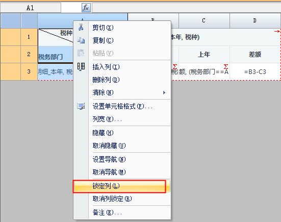 以“税收收入分城区分税种情况表”为例,由于横向扩展数据较多,需将行头固定,设置方法:选择A列列头右键选择“锁定列”,如下图: