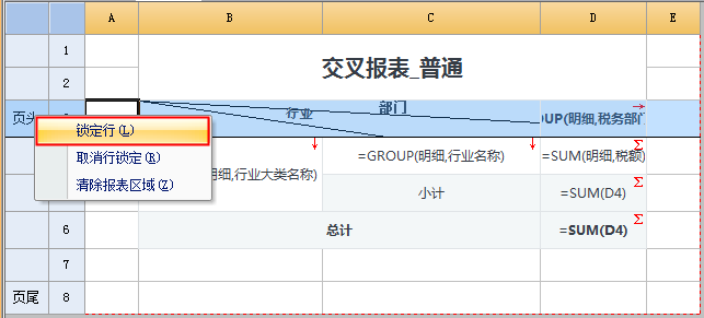 以“各行业不同税务部门的税额”为例,由于纵向扩展数据较多,需将列头固定,设置方法:选中页头区域右键选择“锁定行”,如下图: