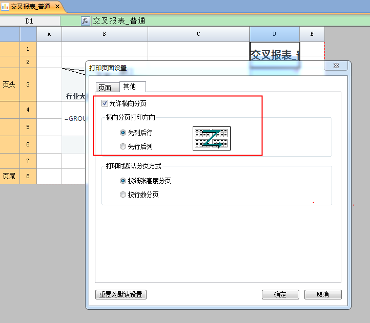 打开工具栏:【报表】-》【页面设置】-》【打印页面设置】窗口,勾选择“允许横向分页”即可: