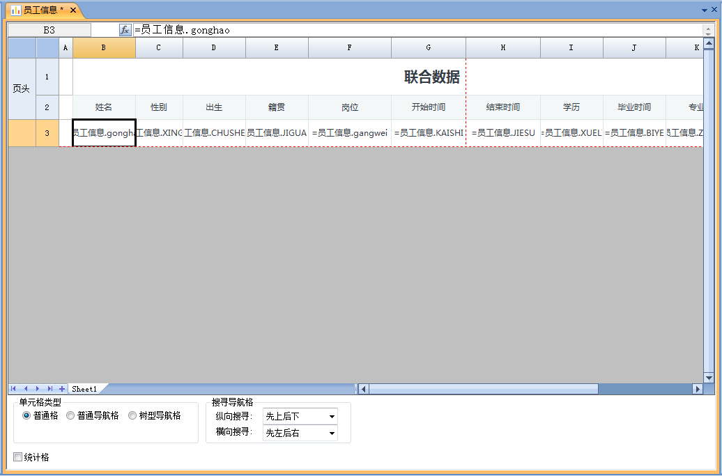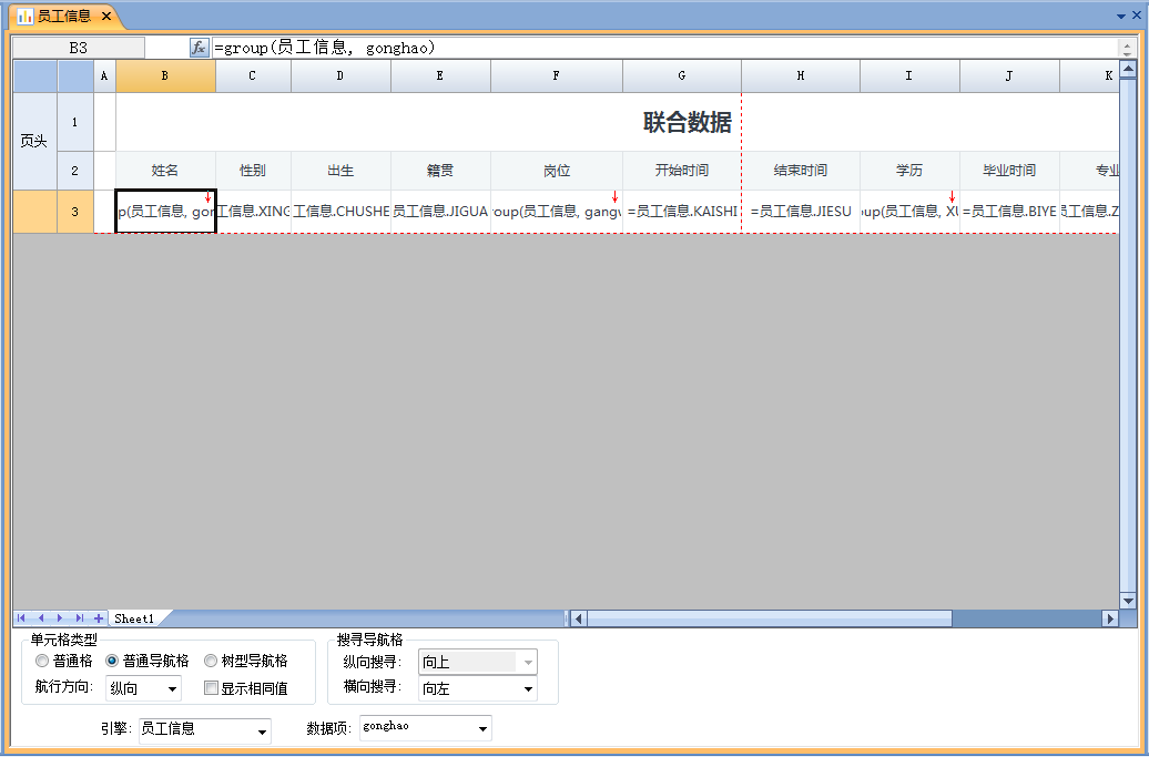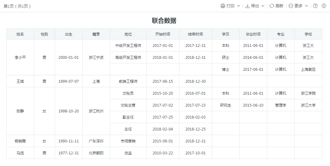 人员基础信息被合并了单元格,岗位信息和学历信息都是各自导航展示。至此,一张简单的横向联合的报表就制作完成了。