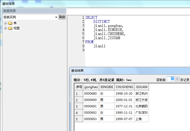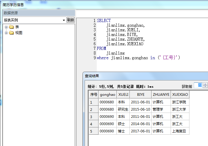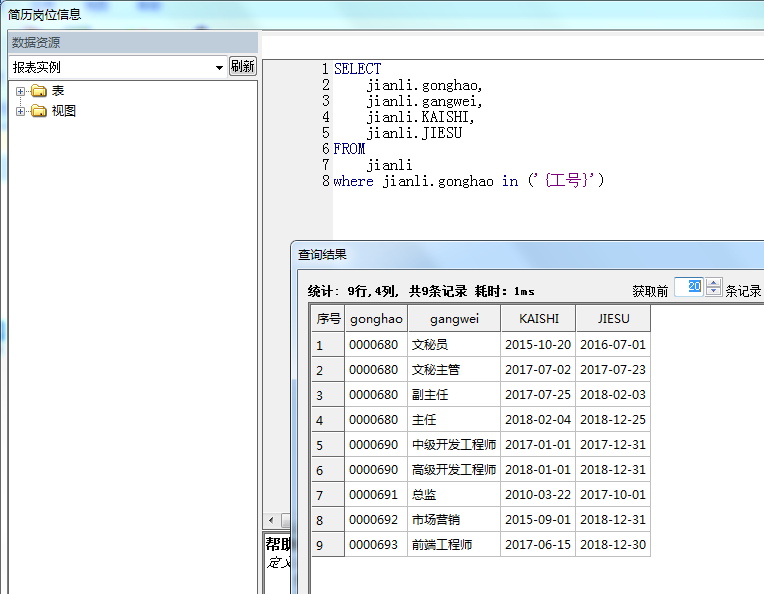现要求将员工“基础信息、职位信息和学历信息”放在一张报表中进行分组显示,每个职员的基础信息后面显示对应本职员的职位信息以及学历信息。