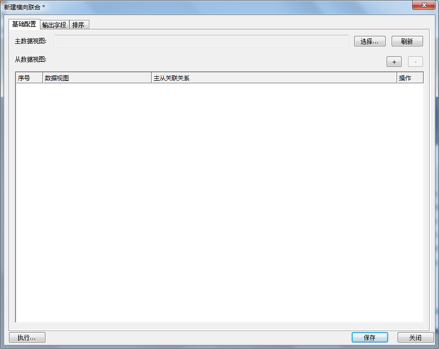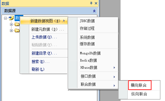 通过“新建数据视图–》联合数据–》横向联合”菜单创建横向联合数据视图,如下图: