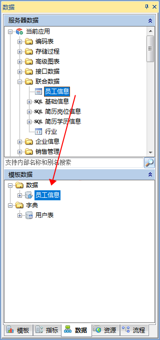 接下来,我们创建一张报表,使用创建好的横向联合数据视图“员工信息”作为该报表的数据源,与其他视图的使用一样,将其拖拽到模板数据中,创建对应的参数即可。