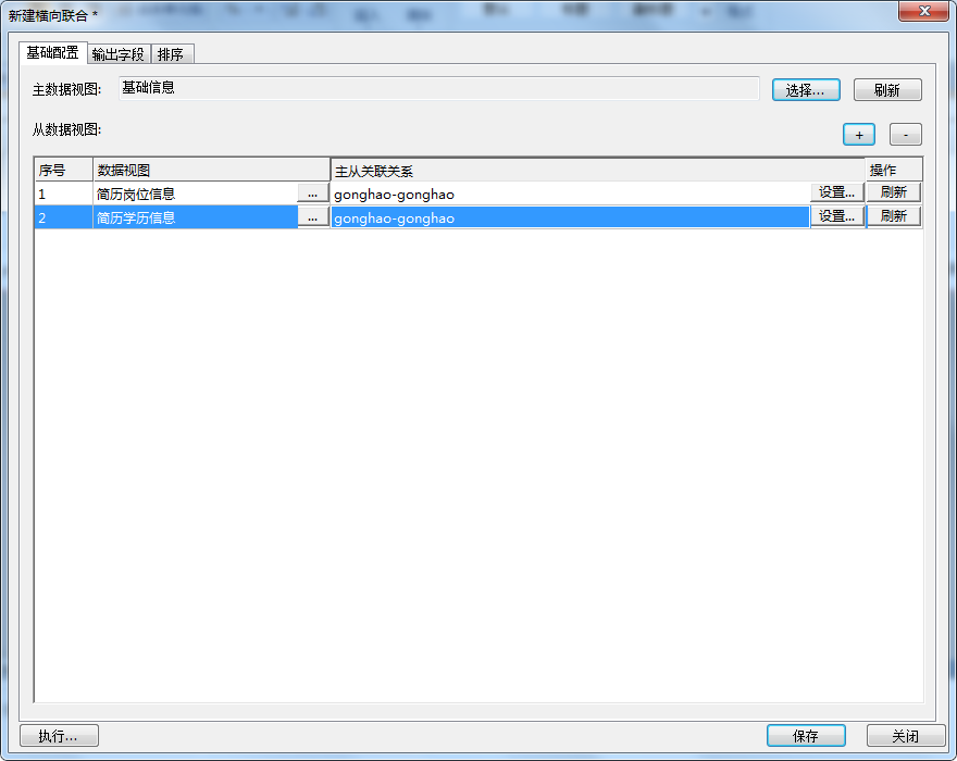 主数据视图中选择提前准备好的主数据视图“基础信息”,同样地,将子数据视图“岗位信息”和“学历信息”逐一添加到从数据视图列表中,配置如下图: