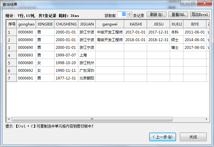 从查询结果可以看出,“横向联合”数据视图已经对数据进行了整理,同时包含了员工的基础信息、岗位信息和学历信息,不足的被补空行。