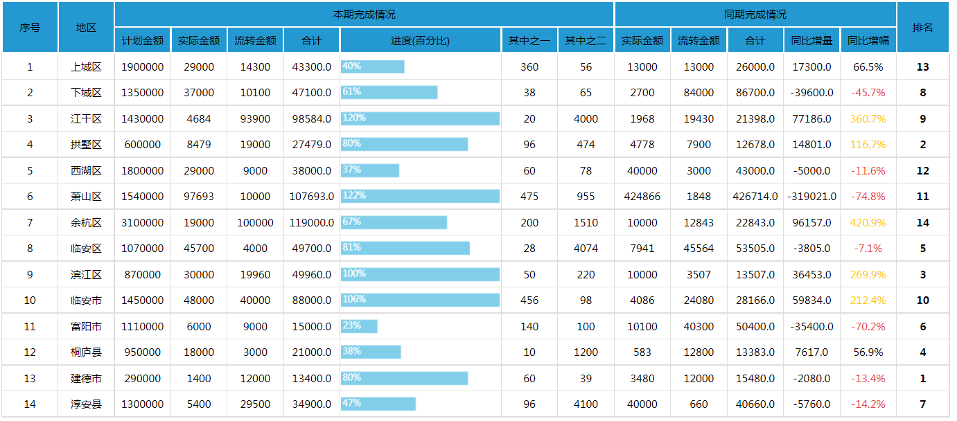 杭州市各区的本期完成金额占比使用进度条的方式显示,效果如下图: