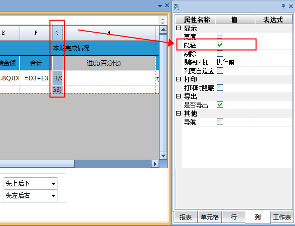 从报表设计中可以看出,G列的单元格只是用于中间计算的,最终不希望在页面中显示对应的数据,所以需要将G列设置为“隐藏”,如下图: