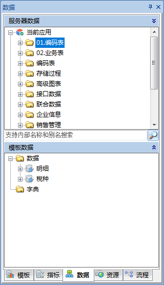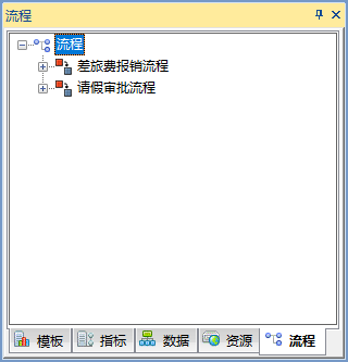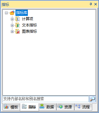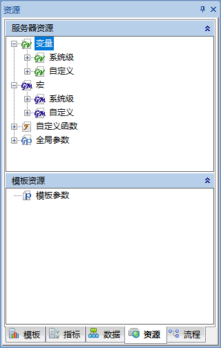 底部的选项卡,包括:模板、指标、数据、资源、流程: