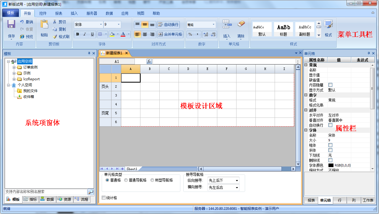 中间的工作区域,上图中显示的是报表模板的“单元格”工作簿,但是,这仅仅针对lczReport和lczExcel,别的模板与此不同。