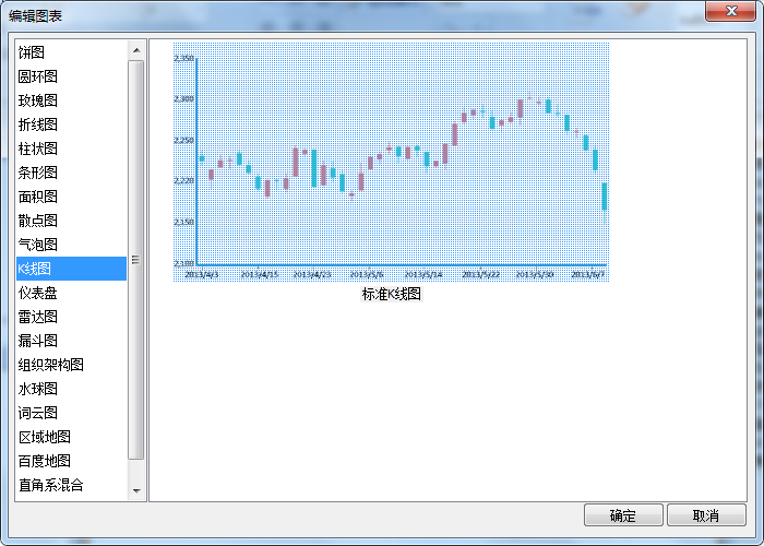 工具栏选择[插入>图表],选择”K线图”类型,如下图: