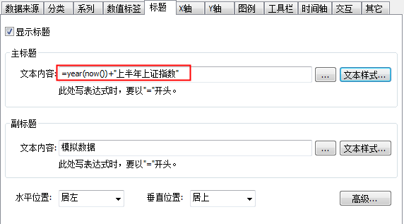 设置图表主标题为“=year(now())+”上半年上证指数””,如下图:
