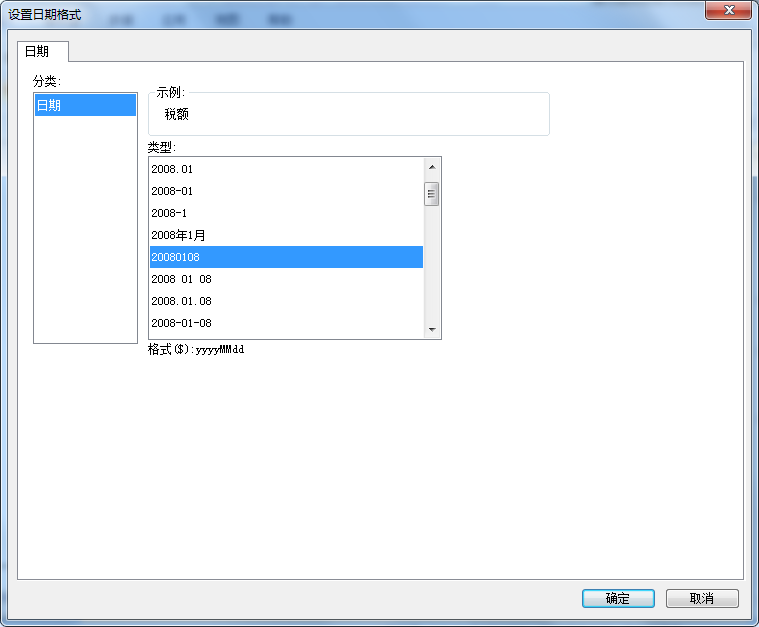 日期格式可以设置日期的显示样式,例如希望日期型的数据显示成“20110101”这样的格式,则选择格式为“yyyyMMdd”的样式即可,如下图所示:
