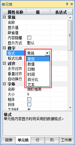 支持的格式包括:常规、数值、日期、时间、百分比、文本,如下图:
