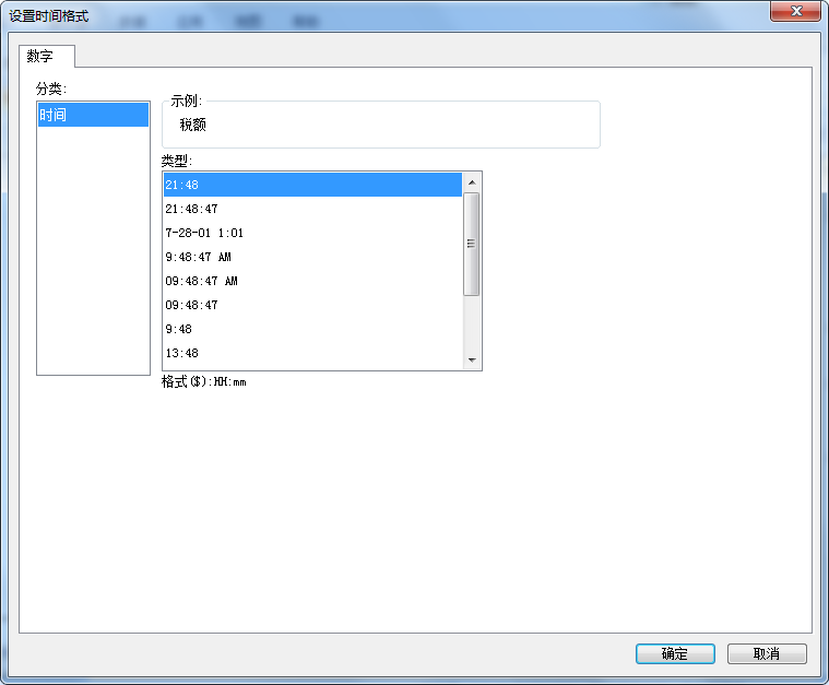 日期格式可以设置日期的显示样式,例如希望时间型的数据显示成“12:30”这样的格式,则选择格式为“HH:mm”的样式即可,如下图所示: