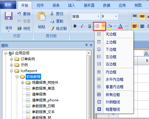 点击菜单工具栏上的[边框]按钮,对单元格边框进行设置,如下图所示: