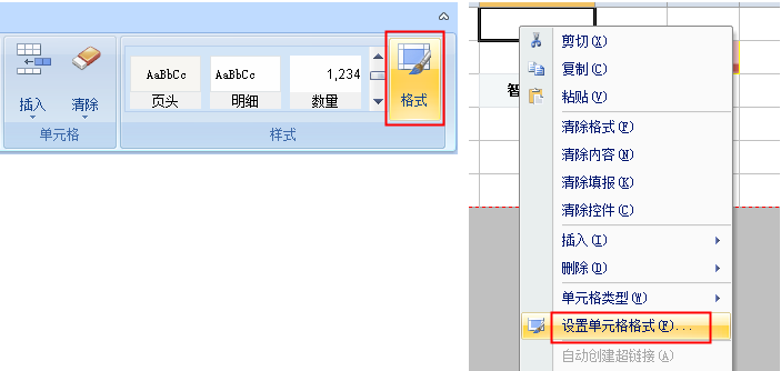 方法三:通过菜单工具栏上的[格式]按钮或单元格右键选择[设置单元格格式],如下图: