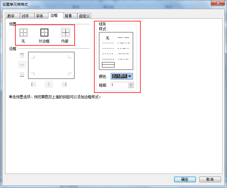 也可以通过菜单工具栏上的[格式]按钮或单元格右键选择[设置单元格格式],进入[边框]tab,自定义内外边框的线条样式、颜色和粗细,如下图: