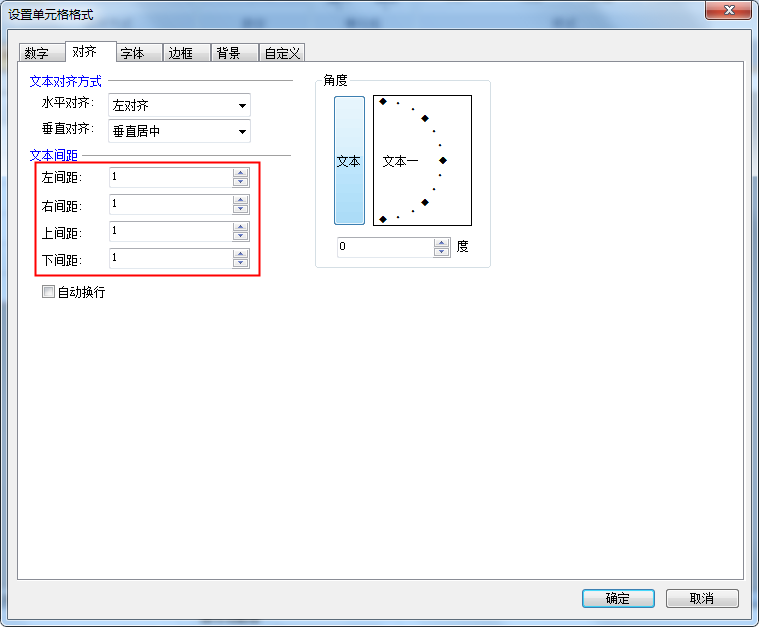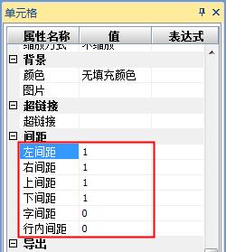 可设置单元格内文本的左间距、右间距、上间距、下间距、字间距、行内间距,可通过单元格属性中的[间距]属性进行配置,如下图所示: