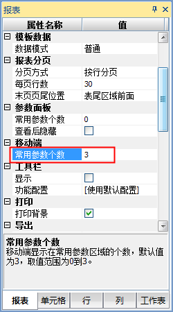 移动端常用参数的设置同PC端,通过【报表属性>移动端>常用参数个数】功能进行设置,默认是0,即均作为高级参数显示。如下图: