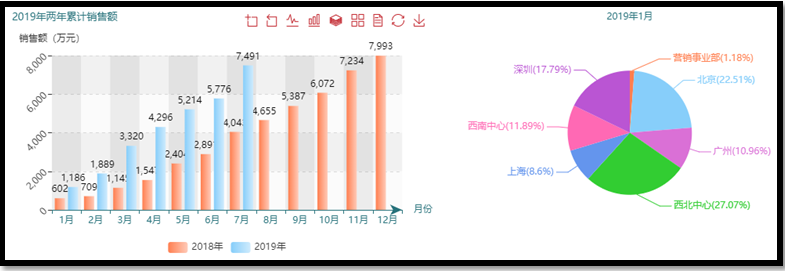 以累计销售额为例,通过点击左边柱状图中的某个柱子,联动饼图及时刷新显示该年份和月份的数据。如下图: