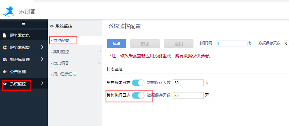 平台管理员(sa)登录乐创者门户,在【系统监控-》监控配置】中,开启“模板执行日志”选项: