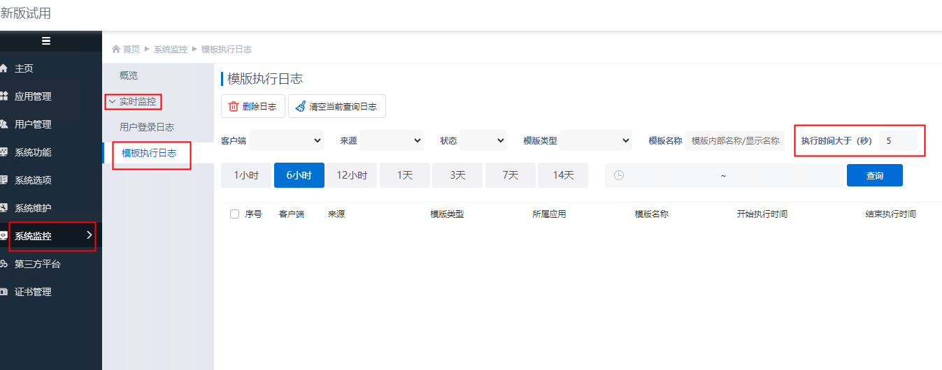 系统管理员(administrator)登录乐创者门户,在【系统监控-》实时监控-》模板执行日志】页面,“执行时间大于”后的输入框中录入认为比较慢的执行时长(如:5秒钟)