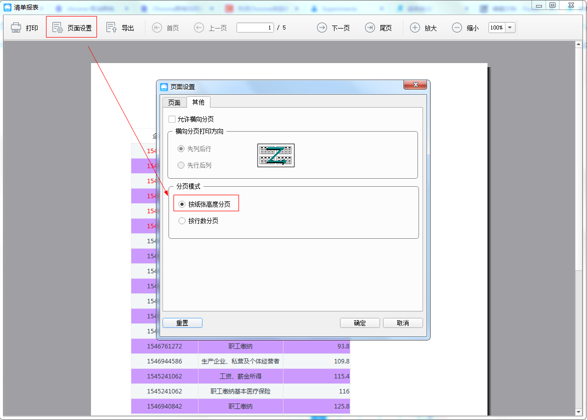 如果在模板设计时指定的打印方式不符合要求,在打印预览时,还可以再次指定打印分页方式: