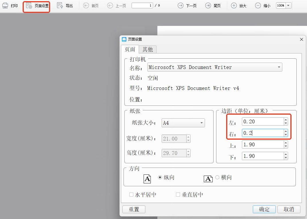 进入打印预览:点击顶部工具栏上的【页面设置】窗口,在弹出窗口中,调小纸张左边边距: