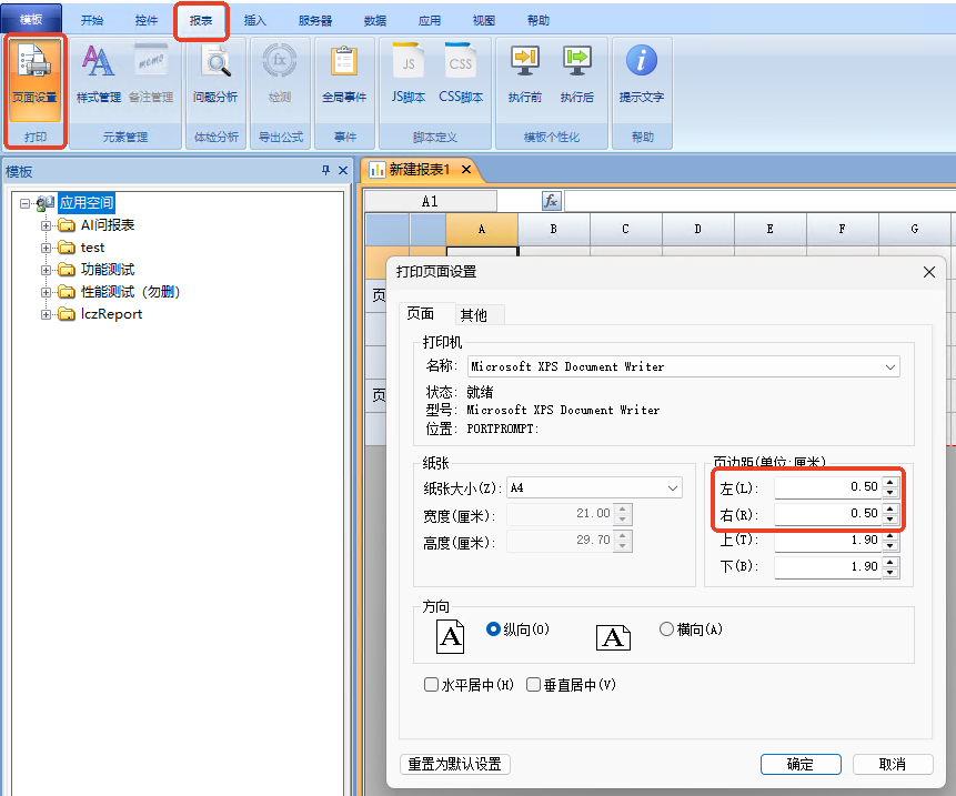 这里调整的左右边距将作为所有客户端该报表的初始值;客户端如果有调整,则使用客户端个性化的配置值。