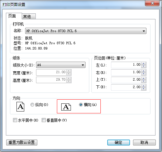 打开工具栏:【报表】-》【页面设置】-》【打印页面设置】窗口,将方向设置为“横向”: