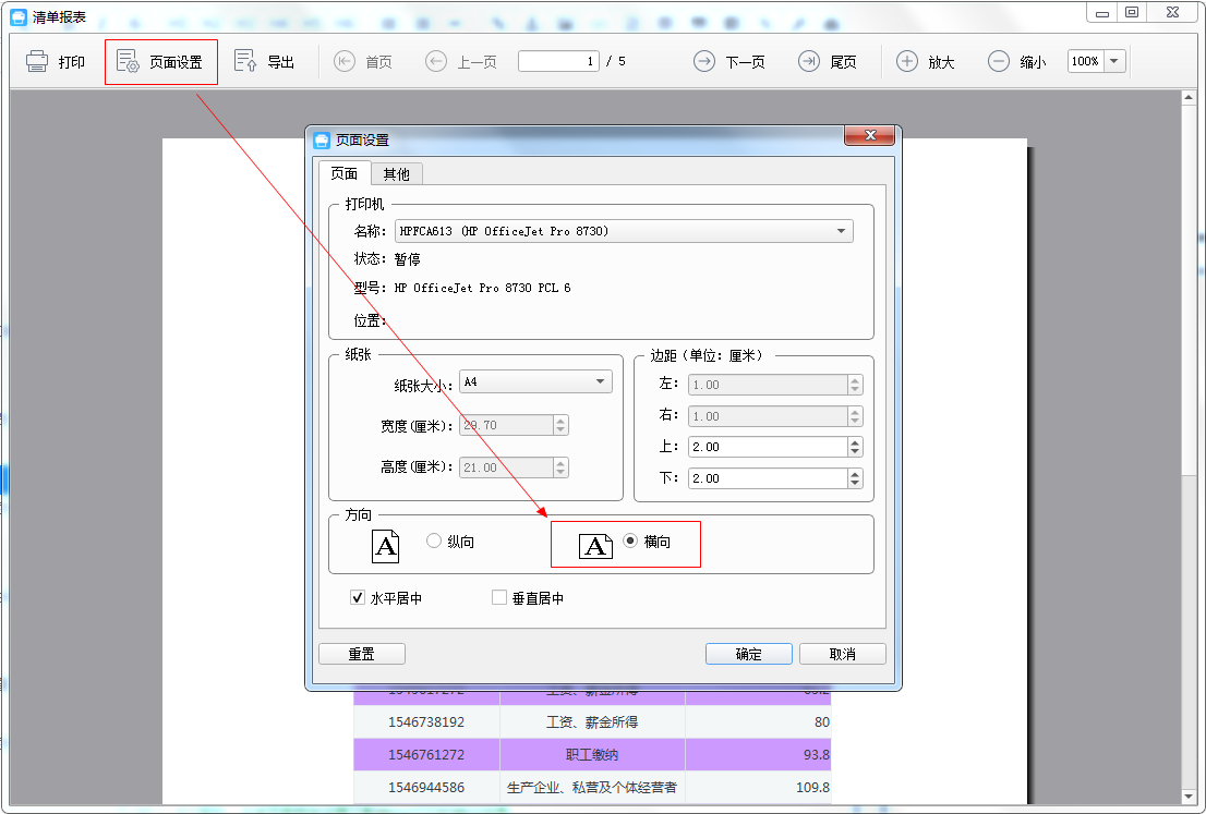 报表执行后,点击“【打印】-》【打印预览】”进入打印预览界面,通过“页面设置”界面,将方向设置为“横向”。