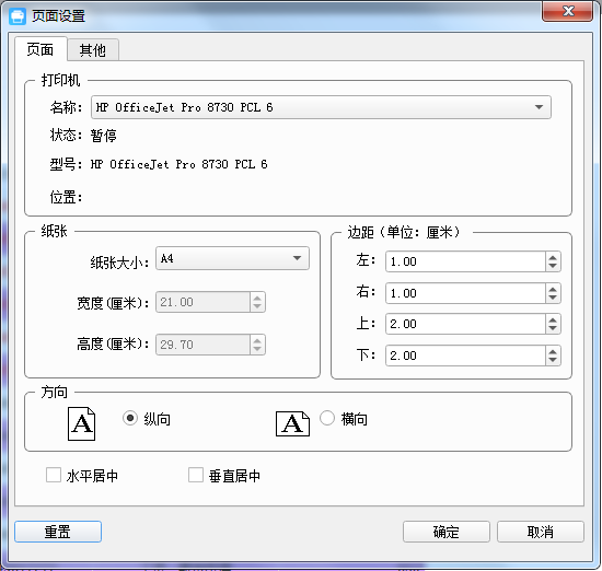 1)此处的“重置”是将打印时的页面设置恢复为模板的页面设置;