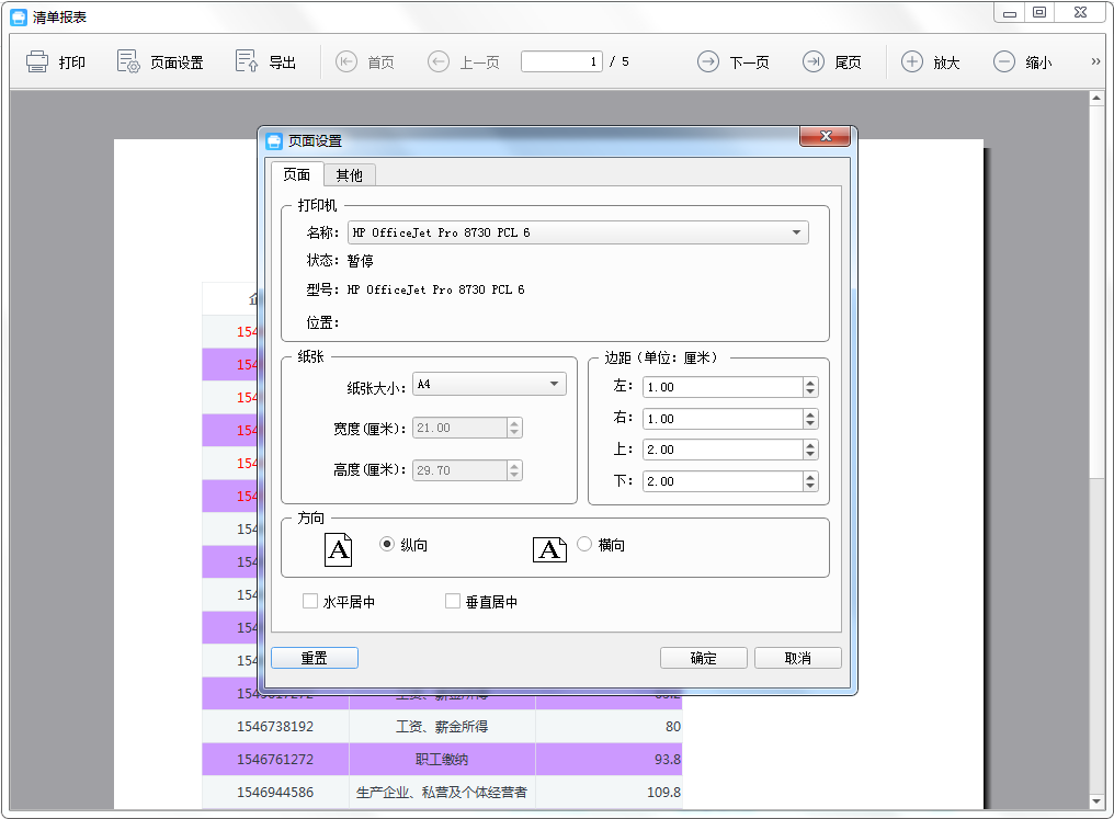 在报表打印时,连接的打印机品牌不同,可能会存在细微的差异,这时候,打印用户可以通过打印插件中的“打印页面设置”窗口进行微调:
