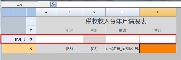 在此例中E4单元格为当前单元格,E4单元格逐级受限C4、B4两个导航格约束,含义分别为“月份”、“年份”。现在要在E4用到上月税额,即对应当前单元格“月份”导航格的上一条记录,所以在C4上右击弹出菜单,选择“增加偏移行”,在“增加偏移行”窗口中设置“相对偏移 -1”,点击“确定”,结果如下图: