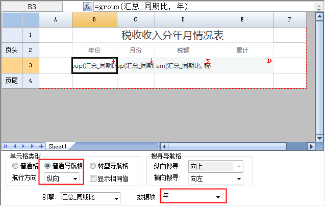 1)设置 B4、C4 单元格为普通导航格,航行方向均为“纵向”,不同的是数据项:B4选择“年”,C4选择“月”,如下图: