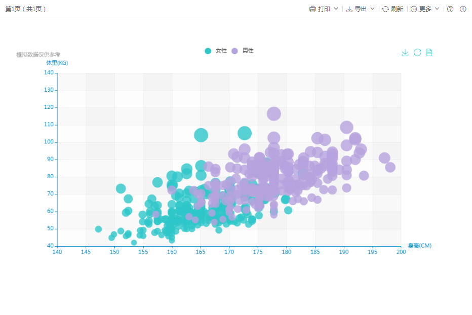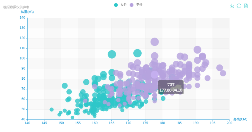 以气泡图的方式展示“男性女性的身高体重情况”,效果如下: