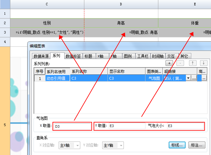 示例中“性别”为图表的系列,X取值为“身高”,Y取值为“体重”,气泡大小为“体重”,分别设置表格中对应值所在单元格,设置如下图: