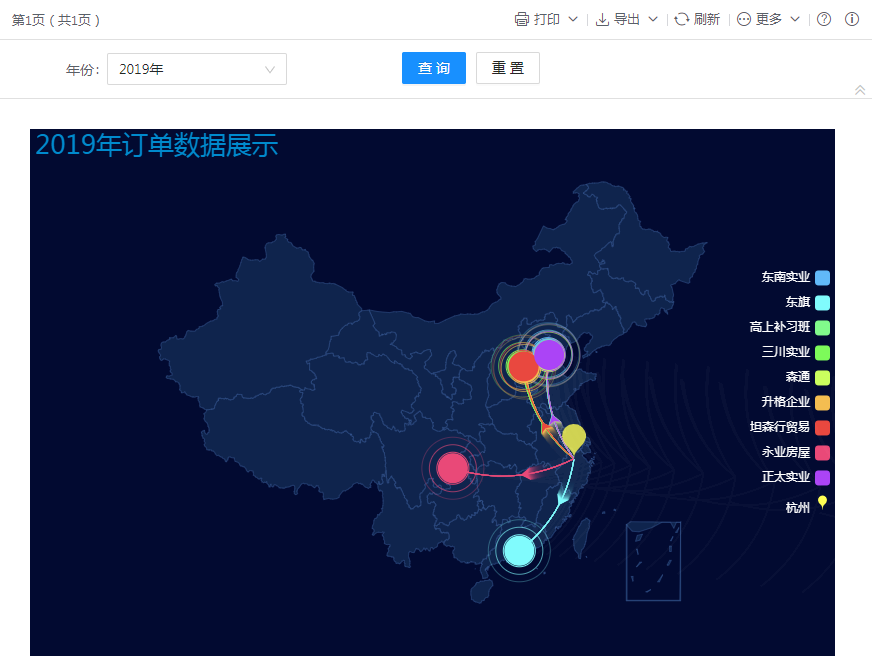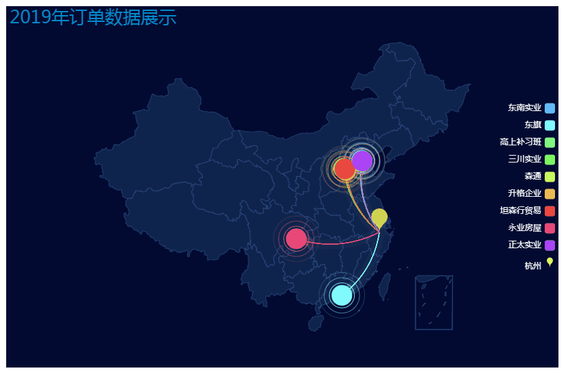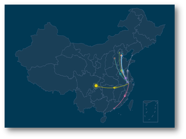区域地图混合图是在区域地图的基础上结合线图和散点图实现的高级图表,可在展示区域流向的同时以特效散点的形式展示各区域的数值大小。