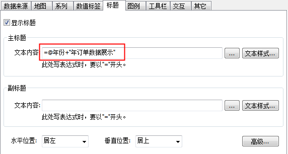 设置图表主标题为“=@年份+”年订单数据展示””,如下图: